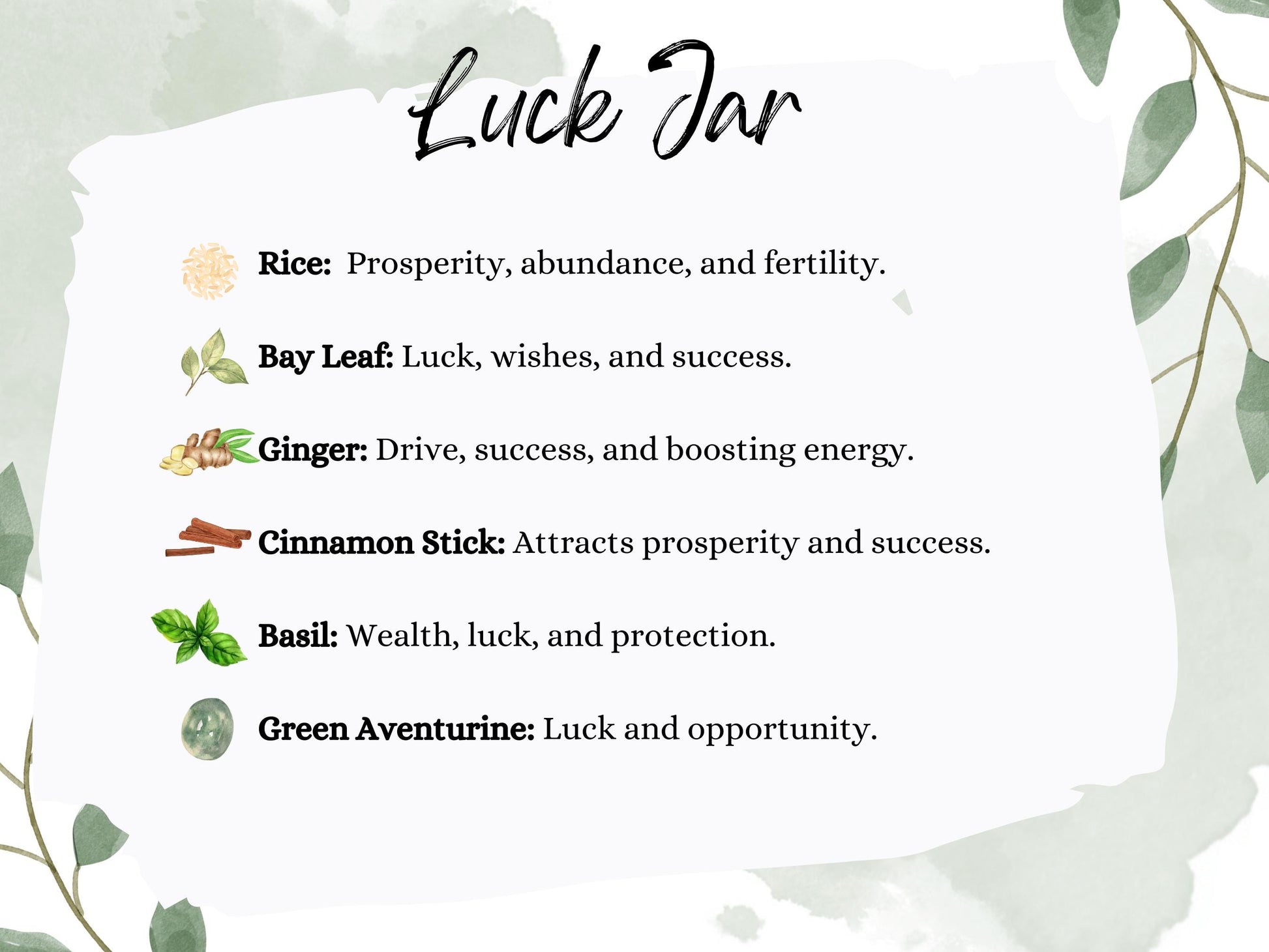 ☆Bay Leaf: These are often used to manifest wishes and attract positive energy. Write your intention or wish for luck on the bay leaf before placing it in the jar to amplify the spell’s power.